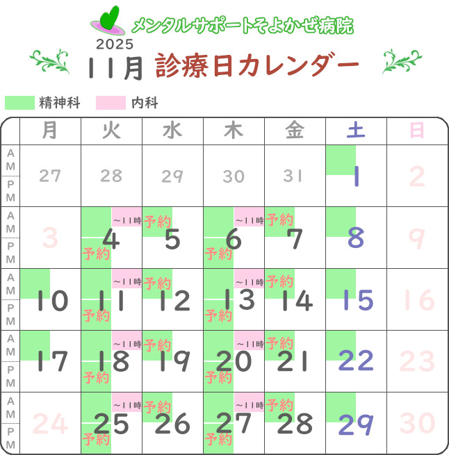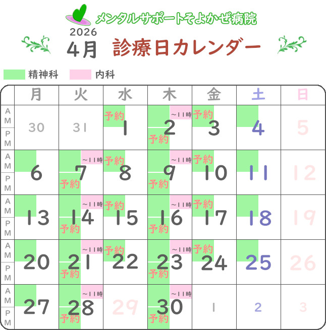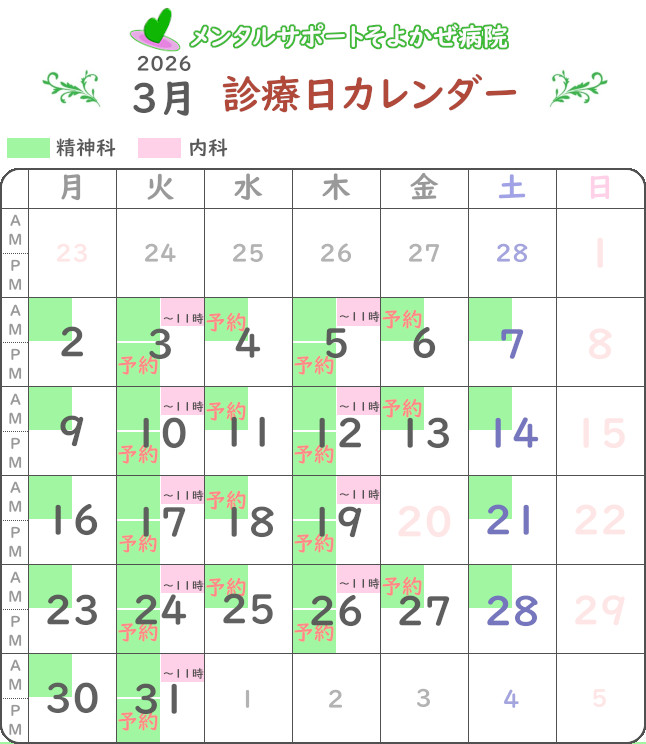 精神科:月〜土 午前診察 9:00〜 (受付時間 7:30〜11:30)